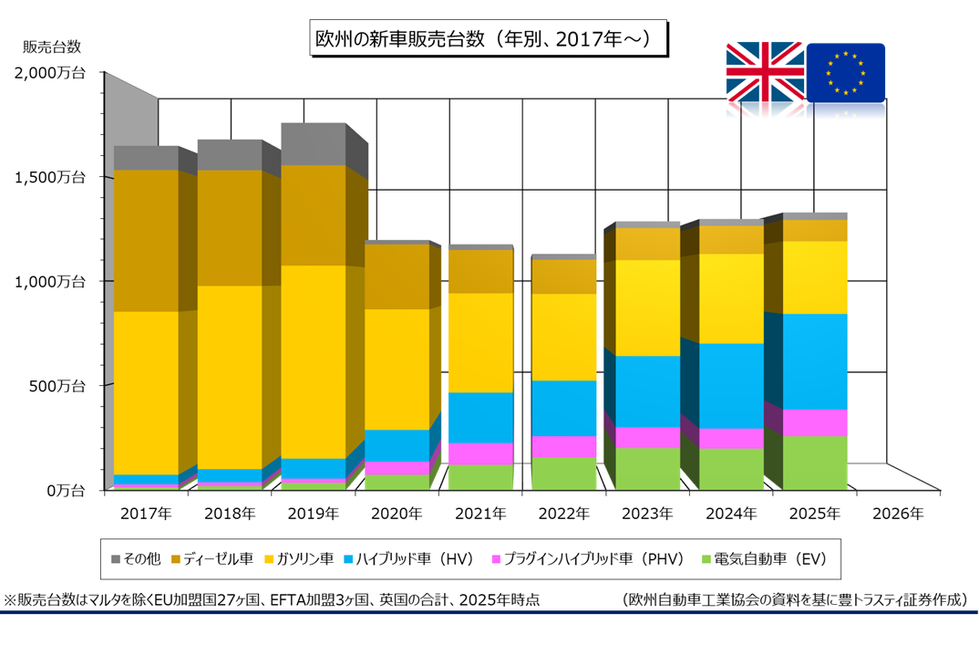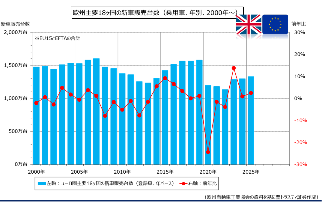 欧州自動車工業会(ACEA)が1月27日に発表した2025年欧州新車販売台数(乗用車、マルタを除くEU加盟国27ヶ国、EFTA加盟3ヶ国、英国の合計)は、前年比2.4%増加の1327万1270台でした。3年連続で増加しております。