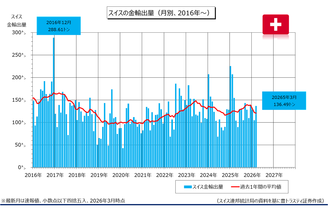 スイス連邦統計局によると、3月スイス金輸出量(速報値)は前年同月比11.6%減少の136.49トンと、3ヶ月連続でマイナスとなりました。ただ、昨年8月(104.72トン)以来の低水準に留まった前月(104.84トン)は上回っております。