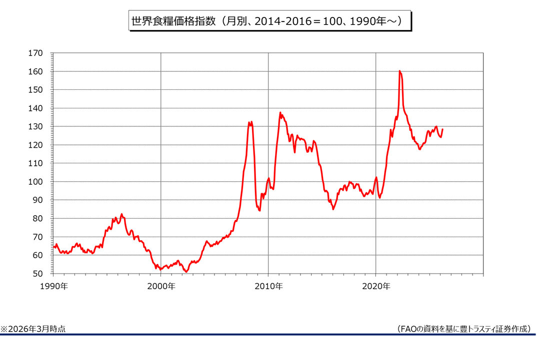 国連食糧機関(FAO)が4月3日に発表した3月世界食糧価格指数は前月比3.0ポイント上昇の平均128.5と、2ヶ月連続で上昇。中東紛争の影響で昨年9月以来の高水準となりました。前年同月比でも1.0%上昇と、6ヶ月ぶりに上昇に転じております。