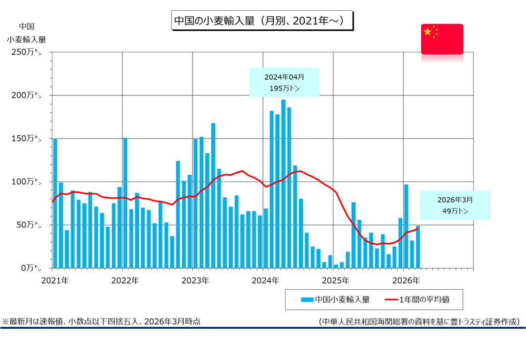2026年3月中国小麦輸入量は前年同月比約2.5倍増加の49万トンでした(前年同月は19万トン)。5ヶ月連続でプラスとなっております。