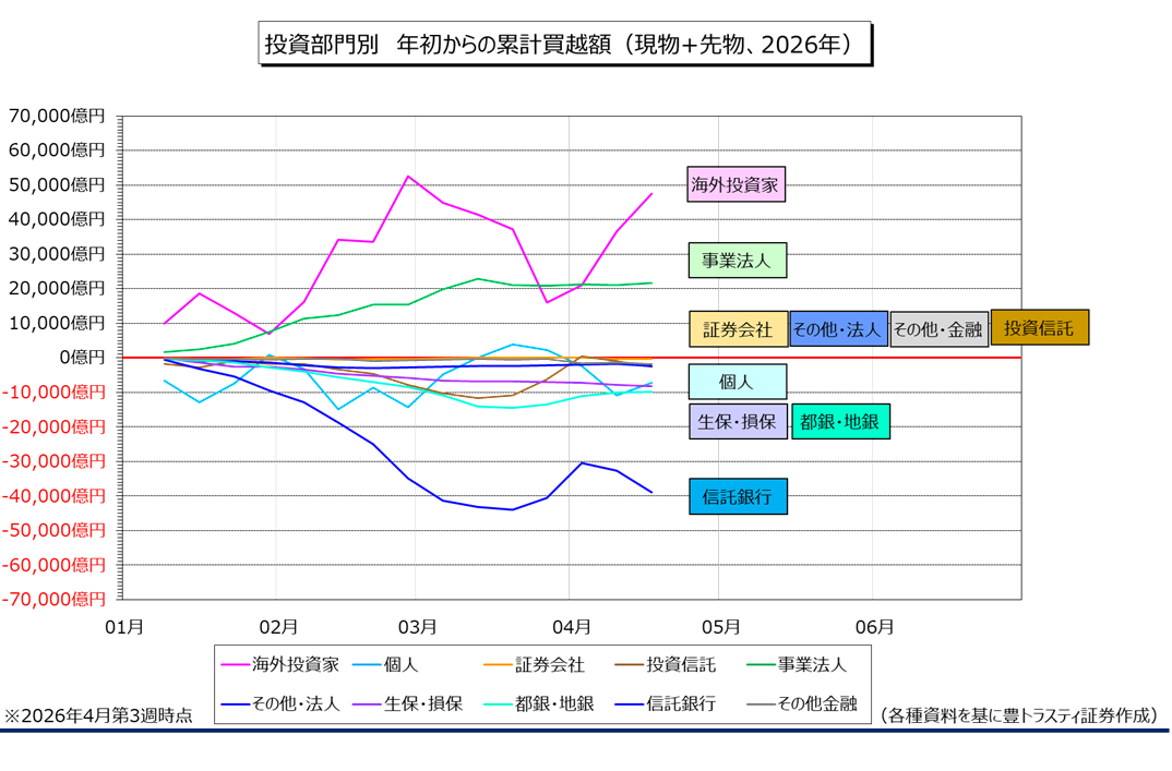 事業法人は589億円の買い越しと、買い越しに転じました。年初からの累計は2兆1724億円の買い越し。現物は700億円の買い越しと、3週連続で買い越しております。