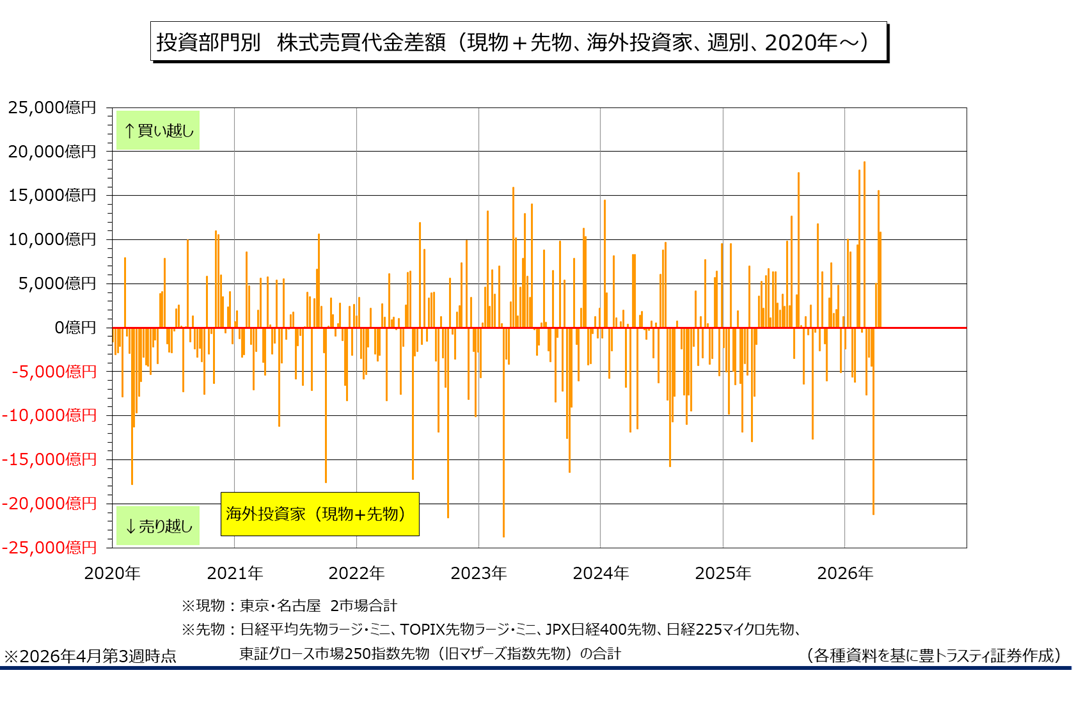 日本取引所グループ(JPX)のデータによると、4月第3週(4月13日~4月17日)の海外投資家による日本の現物株と先物合計の売買は1兆0829億円の買い越し。3週連続で買い越しとなり、2週続けて1兆円を上回りました。年初からの累計は4兆7445億円の買い越し。現物は9977億円の買い越しと、3週連続で買い越し。また、先物は852億円の買い越しと、4週ぶりに買い越しております。