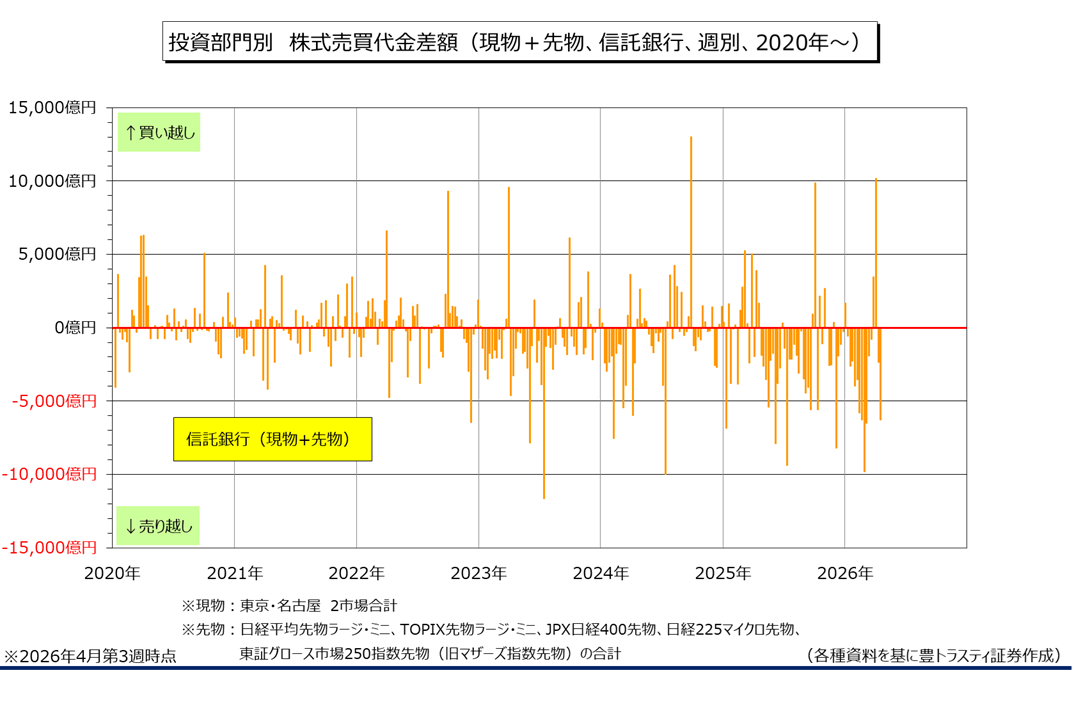 年金基金の売買動向を反映するとされる信託銀行は6275億円の売り越しと、2週連続で売り越しております。年初からの累計は3兆8999億円の売り越し。現物は1854億円の売り越し、先物は4420億円の売り越しと、共に2週連続で売り越しております。