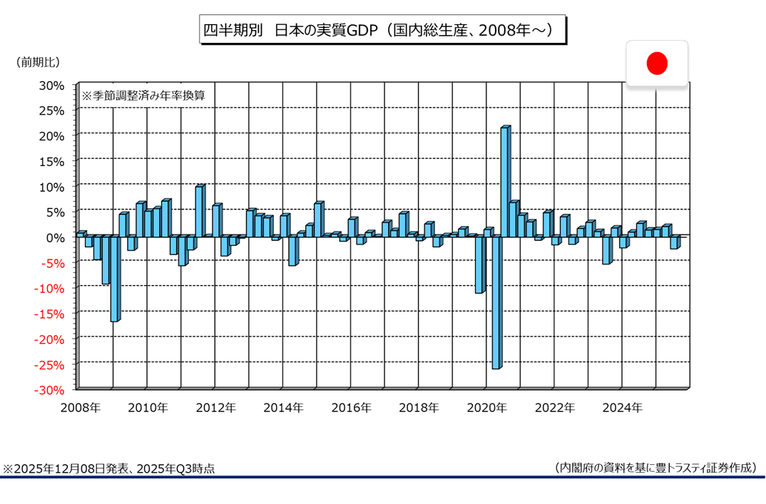 内閣府が12月8日に発表した2025年7-9月期GDP(国内総生産、季節調整済み)改定値は、物価変動の影響を除いた実質で前期比0.6%減、年率換算で2.3%減となり、11月発表の速報値(前期比0.4%減、年率1.8%減)から下方修正されました。企業の設備投資の低迷が要因。
