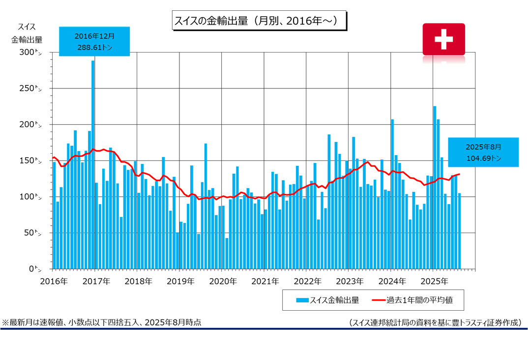 スイス連邦統計局によると、8月スイス金輸出量(速報値)は前年同月比18.1%増加の104.69トンでした。3ヶ月連続でプラスとなったものの、前月(129.06トン)を下回り、5月(89.84トン)以来3ヶ月ぶり低水準となっております。2025年1-8月期累計では前年同期比14.2%増加の1144.44トン。