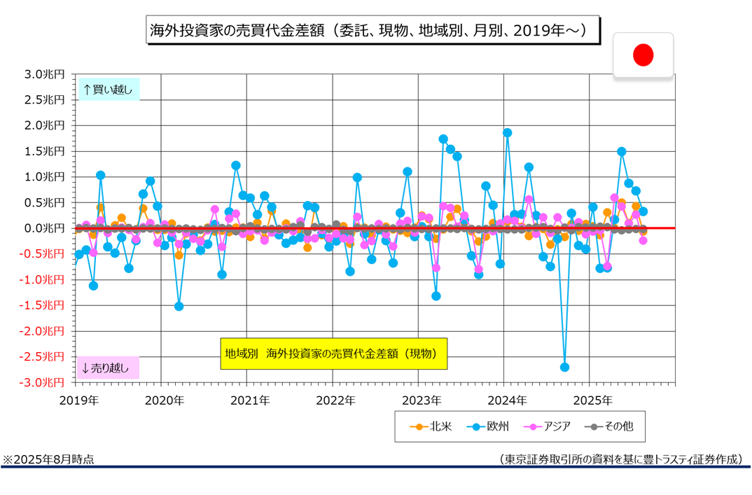 一方で、欧州勢は3283億円の買い越しと、5ヶ月連続で買い越しとなっております。欧州の売買動向は年金基金や中東からのオイルマネーなどの動きが反映され易いと言われます。