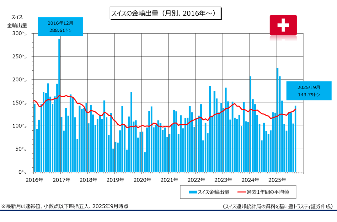 スイス連邦統計局によると、9月スイス金輸出量(速報値)は前年同月比74.4%増加の143.79トンと、4ヶ月連続でプラス。前月(104.71トン)を上回り、3月(154.44トン)以来6ヶ月ぶり高水準となっております。2025年1-9月期累計では前年同期比18.8%増加の1288.22トン。