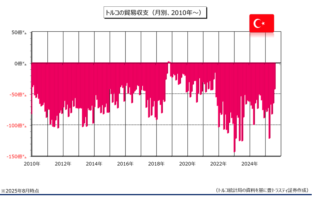 また、同局が9月30日に発表した8月トルコ貿易収支は42億1095万ドルの赤字でした。赤字幅は前年同月(50億0384万ドルの赤字)から縮小しております。(前月は64億7139万ドルの赤字)。