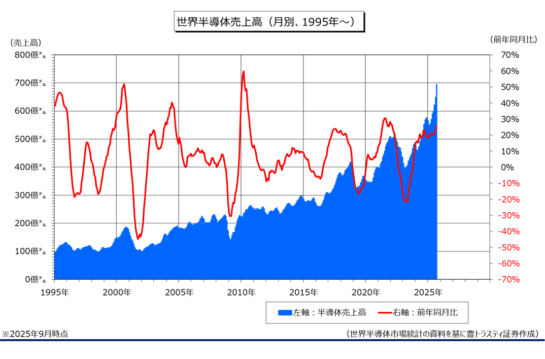 主要半導体メーカーで構成する世界半導体市場統計(WSTS)がとりまとめ、米国半導体工業会(SIA)が発表した9月世界半導体販売額は、前月比7.0%増の694.7億ドルと、7ヶ月連続でプラス。前月(649.1億ドル)を上回り、5ヶ月連続で最高値を更新しております。