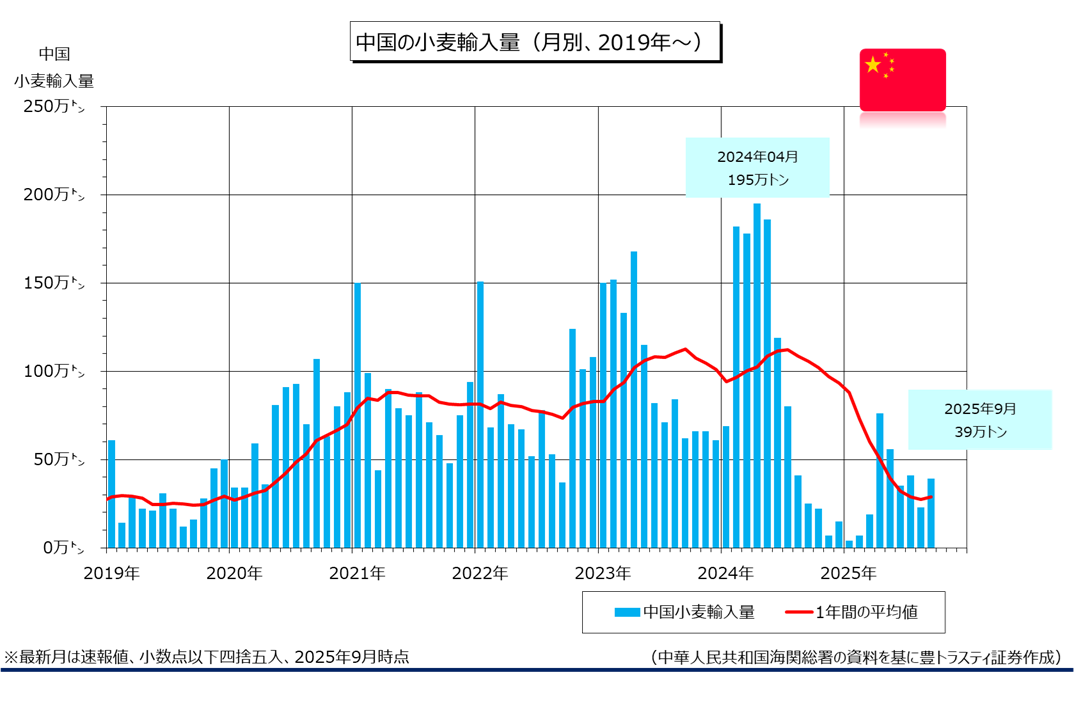 9月中国小麦輸入量は前年同月比56.0%増加の39万トンでした。14ヶ月ぶりにプラスに転じております。2025年1-9月期累計では前年同期比72.1%減の300万トン。