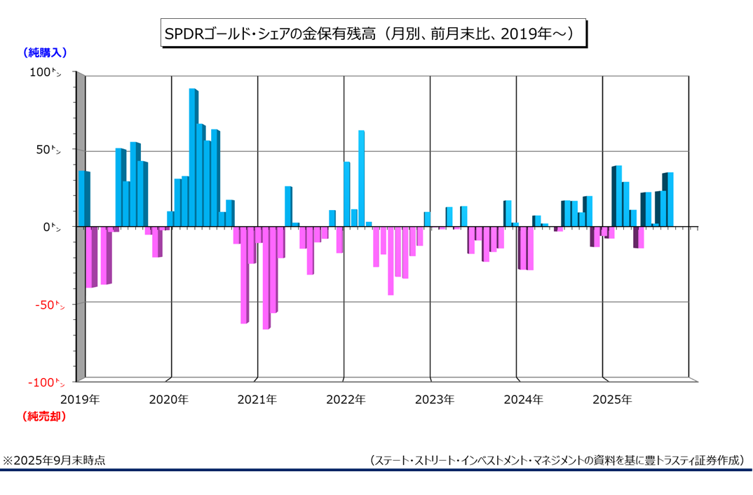 なお、四半期ベースで見てみると、「SPDRゴールド・シェア」は前期末比60.34トン増加。5四半期連続で増加しております。また、「SPDRゴールド・ミニシェア」は同21.21トン増と、8四半期連続で増加。「iシェアーズ・ゴールド・トラスト」は同39.15トン増と、4四半期連続で増加しております。