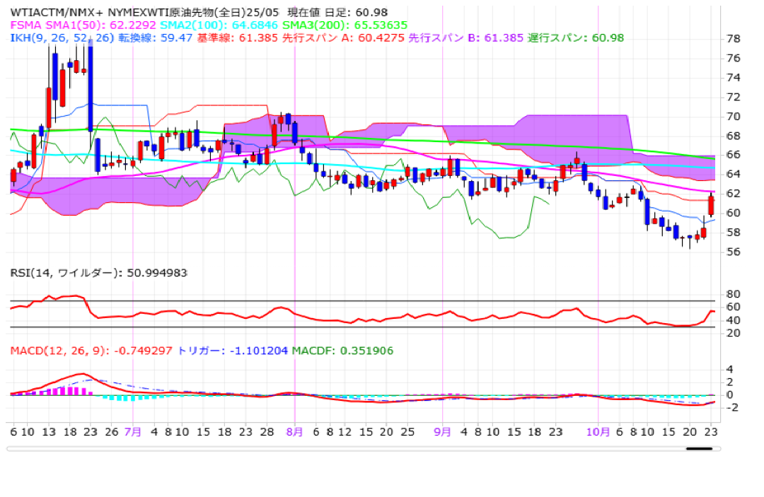 NY原油(中心限月)は、前営業日比3.29ドル高の61.79ドルで終了。トランプ米大統領が停戦に応じないプーチン大統領との会談を中止するとした上で、ロシア石油最大手ロスネフチとルクオイルのほか、30を超える関連会社を制裁対象に指定すると発表したため、ロシア産原油の供給混乱への警戒感が強まり、一時62.20ドルまで上昇するなど、10営業日ぶりに60ドル台を回復しております。