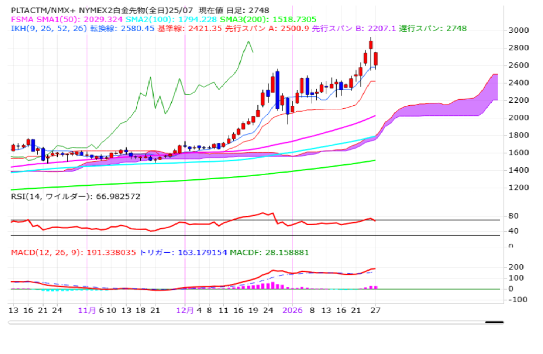 昨晩のNY白金(中心限月)は、前営業日比136.80ドル高の2878.10ドルで終了となり、5営業日続伸。独自材料と言うよりは、金・銀相場を中心とした貴金属相場全体の流れの中で買い進められる中、先週末の高値2776.1ドルを上抜いて、一時2925.0ドルまで上昇するなど、連日で最高値を更新。初めて2900ドル台に乗せる場面も見られております。
