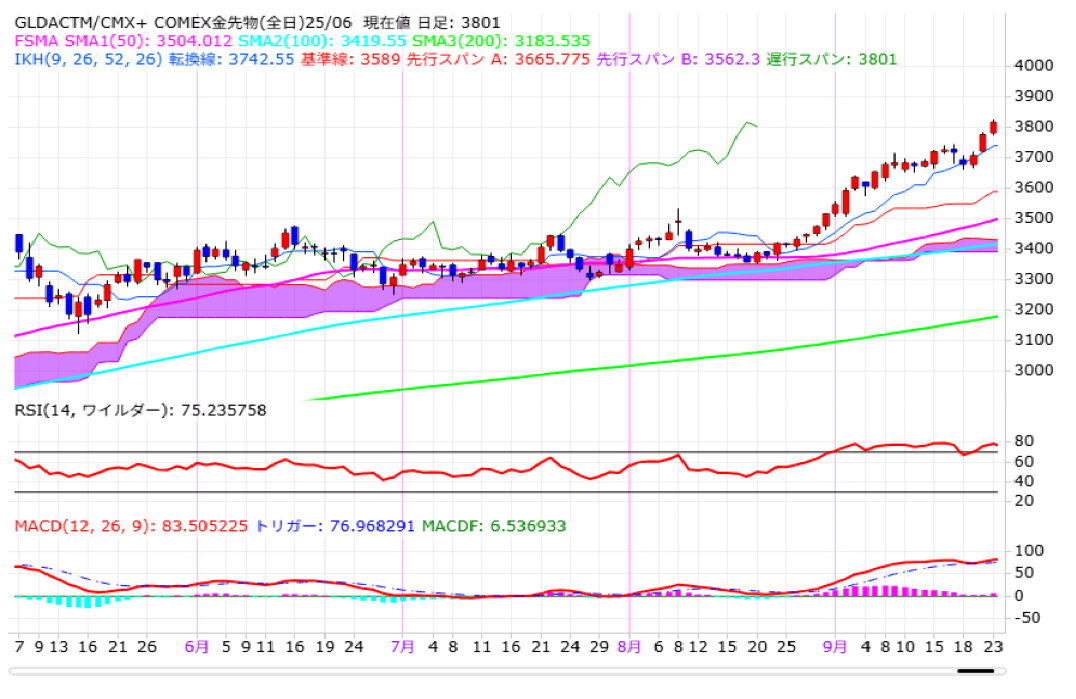 NY金(中心限月)は前営業日比40.6ドル高の3815.70ドルで終了となり、3営業日続伸。一時3824.6ドルまで上昇するなり、連日で最高値を更新。史上初めて3800ドル台に乗せております。