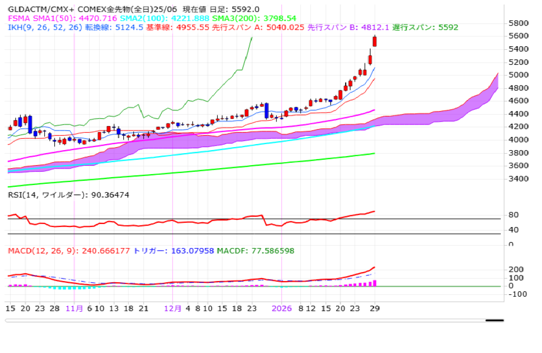 ドル安基調に加えて、トランプ米大統領がSNSで、再びイラン攻撃を警告したことで、中東の「地政学リスク」が高まる中、買い進められたようです。なお、現在取引中の時間外取引も続伸しており、初めて5600ドル台に乗せてきております。