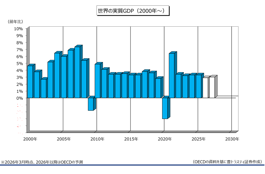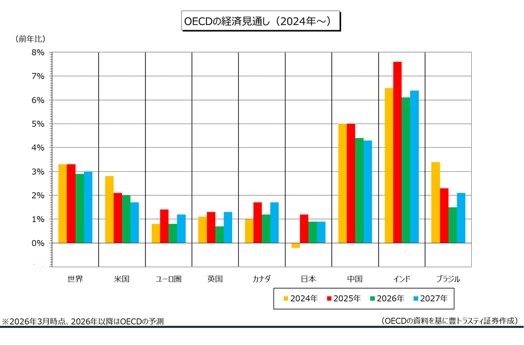 経済協力開発機構(OECD)は3月26日に、最新の世界経済見通しを公表。2026年世界成長率を2.9%と予測。昨年12月時点の見通しで据え置いております。米国とイスラエルによるイラン攻撃が始まった後、主要な国際機関が経済見通しを明らかにしたのは初めて。