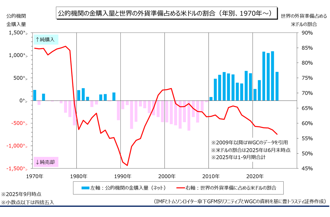 2025年1-9月累計では633.6トンとなっており、3年連続で1000トン購入した前年同時期(724.3トン)に比べると、購入ペースは減速しております。ただ、ドル建て金価格が歴史的高値を付ける中でも、過去に比べて高水準で金準備を積み増しており、4年連続で1000トンの大台に乗せるか注目されます。