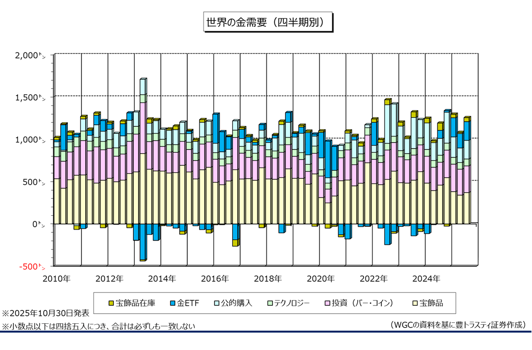 産金業界団体ワールド・ゴールド・カウンシル(WGC)が10月30日に公表した「Gold Demand Trends」によると、2025年7-9月期の世界金需要は前年同期比5.4%増加の1257.9トンと、5四半期連続でプラスとなりました。