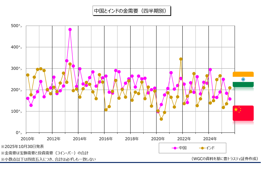 なお、2025年4-6月期の金需要を国別で見てみると、中国は同4.3%減少の157.6トンと、2022年4-6月期(140.6トン)以来の低水準。インドは同15.7%減少の209.4トンと、4四半期連続でマイナス。また、米国は同33.4%減少の31.8トンと、2019年1-3月期(31.3トン)以来の低水準となっております。詳細はこちらを参照ください。