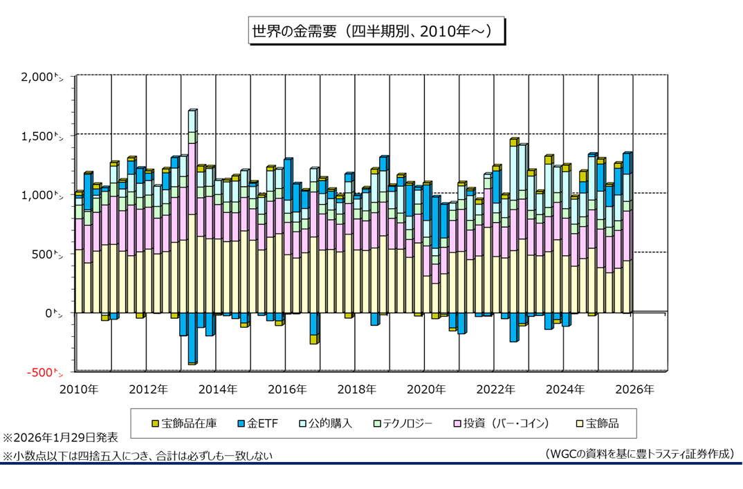 産金業界団体ワールド・ゴールド・カウンシル(WGC)が1月29日に公表した「Gold Demand Trends」によると、2025年10-12月期の世界金需要は前年同期比2.0%増加の1345.3トン。6四半期連続でプラスとなり、少なくとも統計が遡れる2010年以降で最高となっております。OTC(店頭取引)やその他需要を含めた世界金需要は同1.3%増の1302.8トンと、3四半期連続でプラス。少なくとも統計が遡れる2010年以降で最高となった前期(1303.0トン)と、ほぼ変わらずでした。