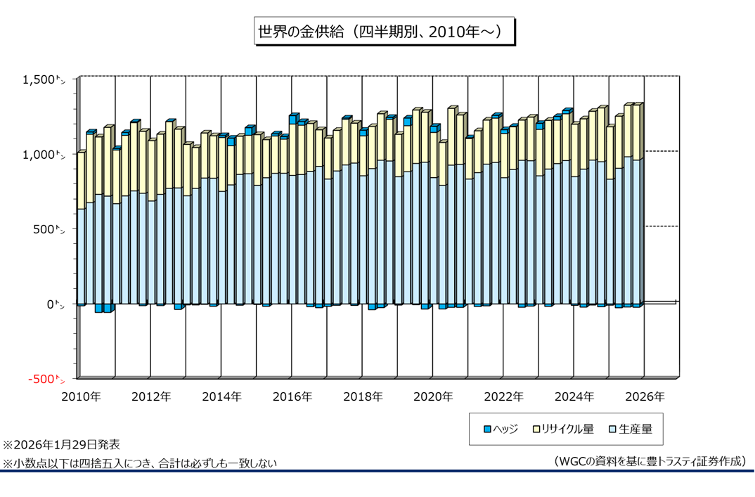 2025年10-12月期の世界金供給量は前年同期比1.3%増加の1302.8トンと、少なくとも統計が遡れる2010年以降で最高となった前期(1303.0トン)と、ほぼ同水準となっております。