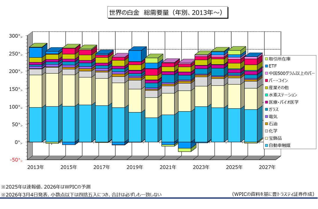 2026年の世界白金総需要は前年比8.2%減少の237.0トンと、2022年(195.5トン)以来4年ぶり低水準に留まる見込み(昨年11月時点の見通しは229.7トン)。