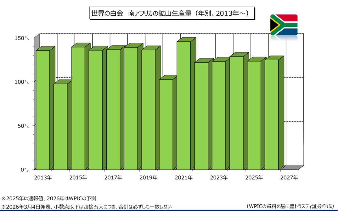 鉱山生産量は前年比0.1%増加の172.7トンと、前年(172.6トン)から微増に留まる見込み(昨年11月時点の見通しは174.9トン)。世界最大の白金生産国である南アフリカの生産量は同1.1%増の124.7トンと、2024年(128.6トン)以来2年ぶり高水準になると予測。ただ、昨年11月時点の見通し(126.1トン)から下方修正されております。鉱山在庫は0.0トンと予測。