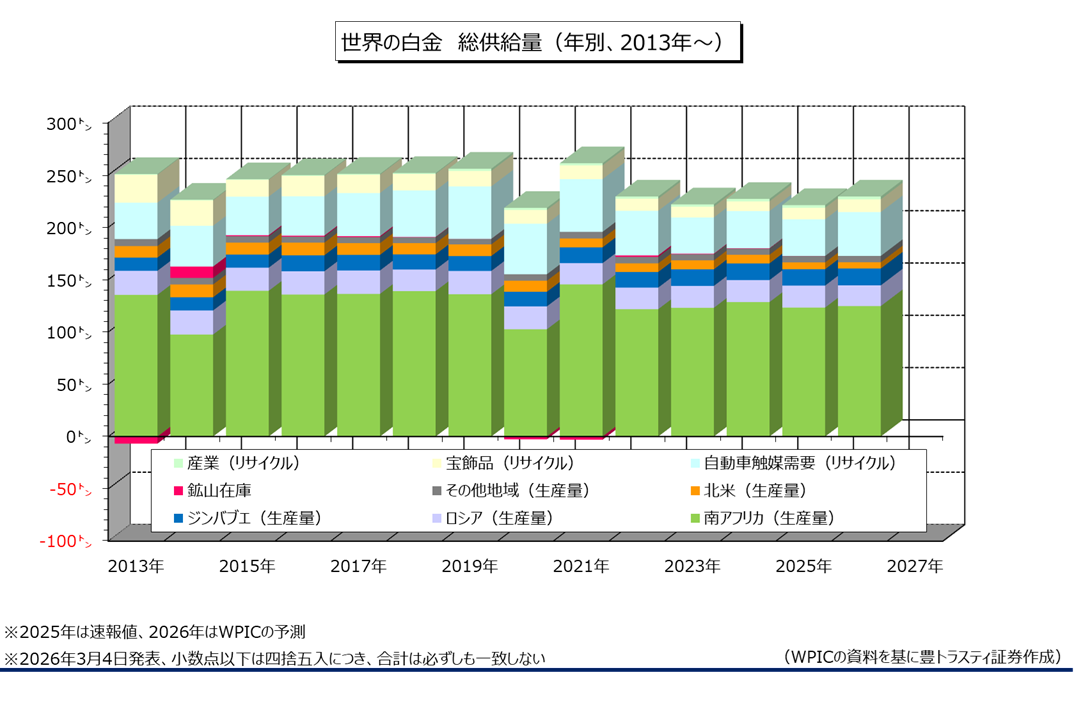 2026年の世界白金総供給は前年比2.3%増加の229.5トンと予測。2021年(258.4トン)以来5年ぶり高水準になると見込んでおります(昨年11月時点の見通しは230.3トン)。
